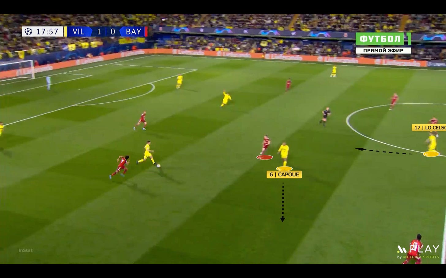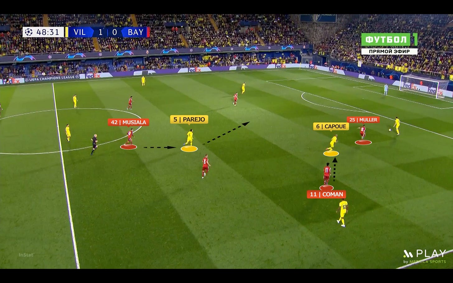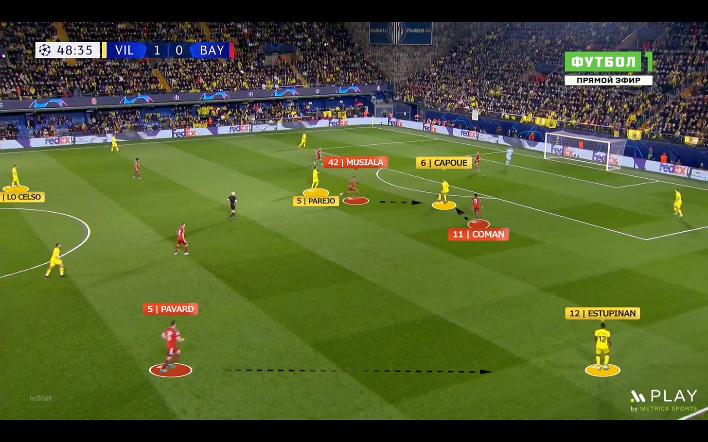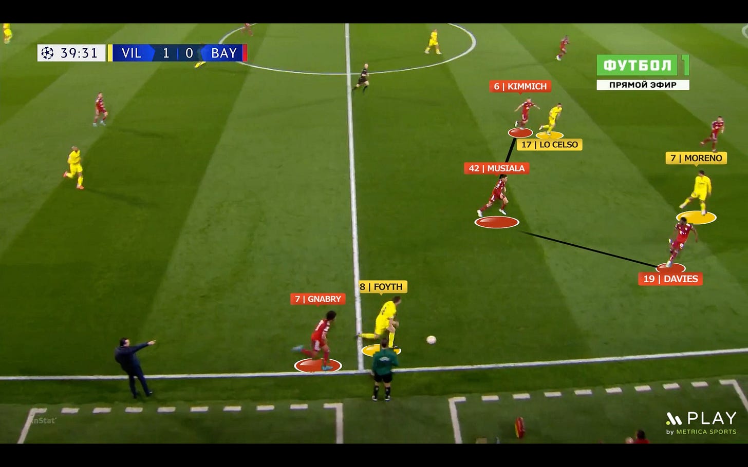 As you can see now, thanks to Nagelsmann tactical tweak, he changed the previous 2v1 situations into a 2v3 situation; with Davies staying back and Musiala getting closer so Lo Celso is marked by Kimmich and not a passing option for Villarreal anymore.