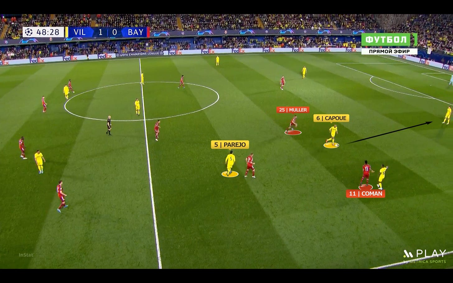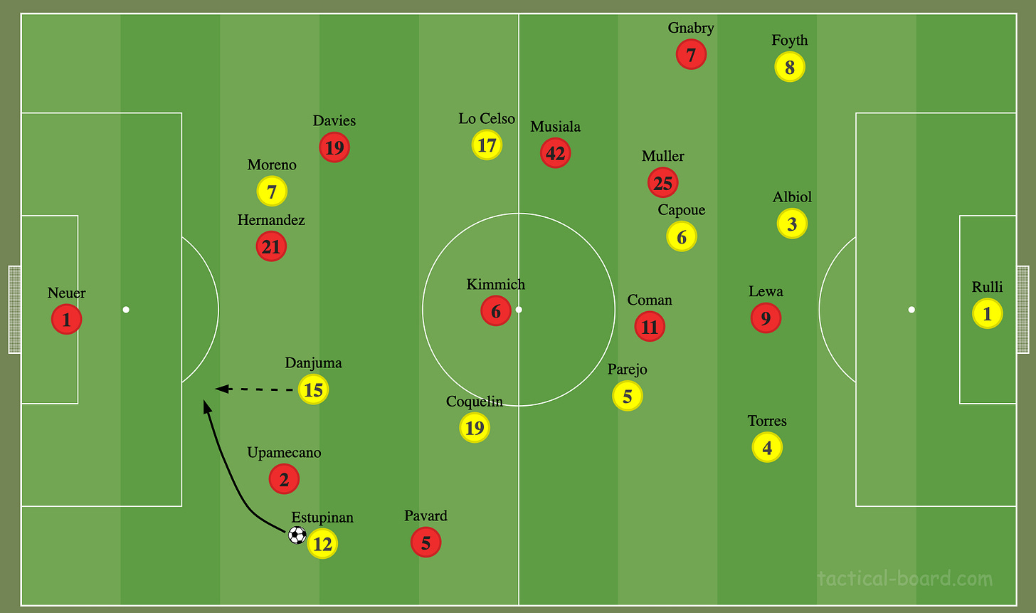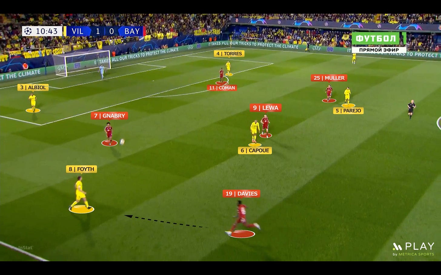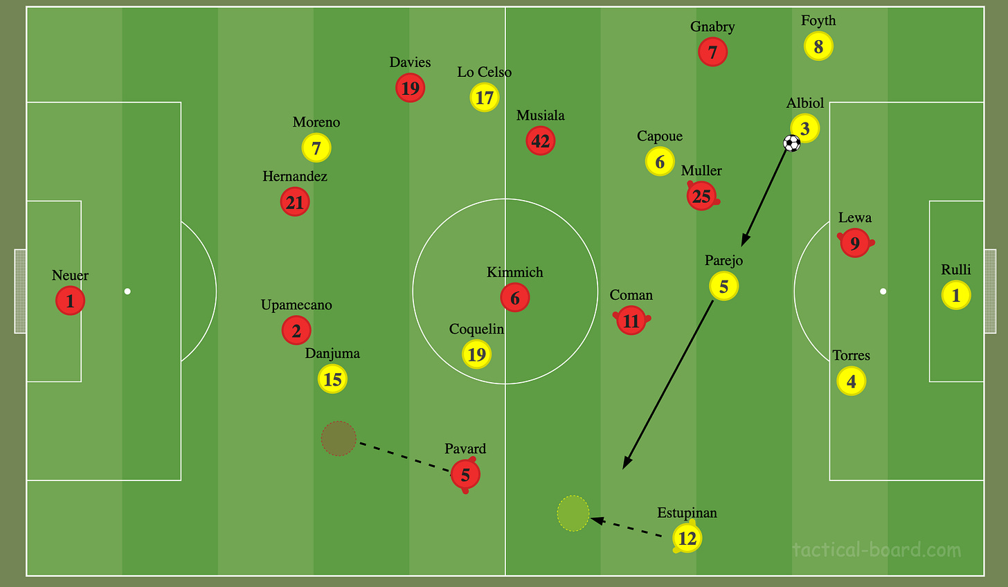 As you can see now, thanks to Nagelsmann tactical tweak, he changed the previous 2v1 situations into a 2v3 situation; with Davies staying back and Musiala getting closer so Lo Celso is marked by Kimmich and not a passing option for Villarreal anymore.