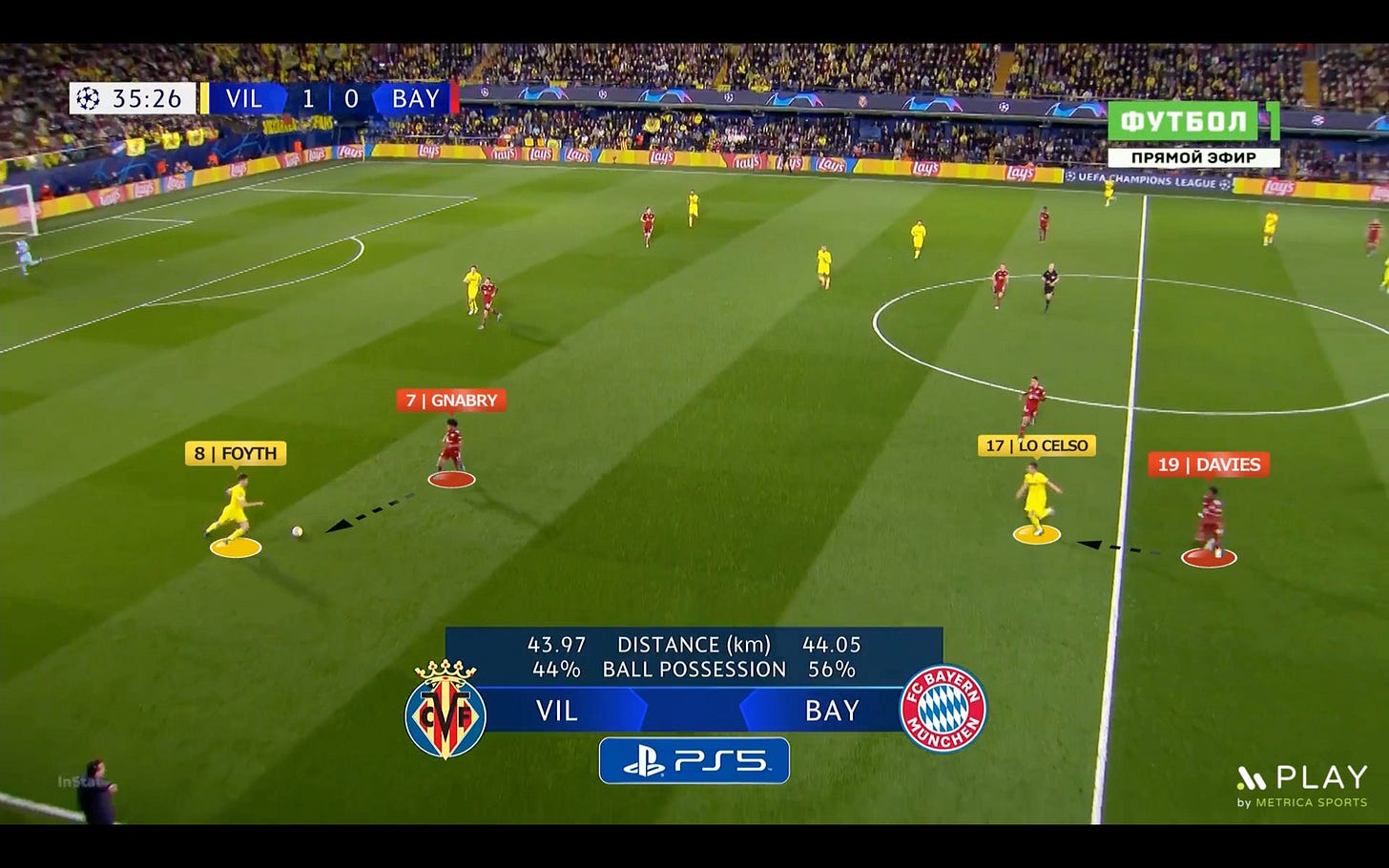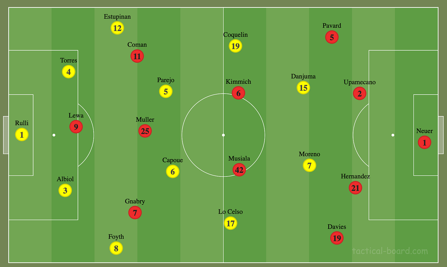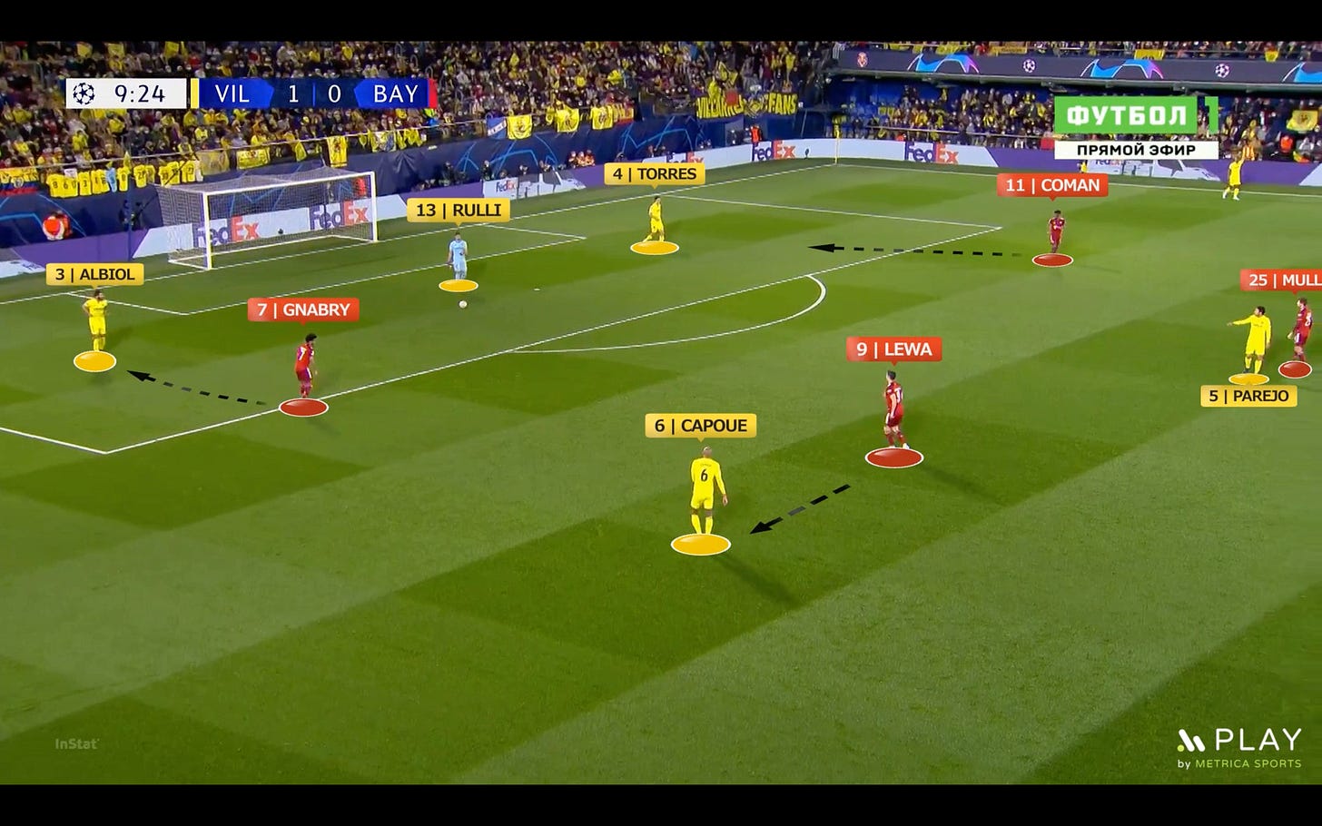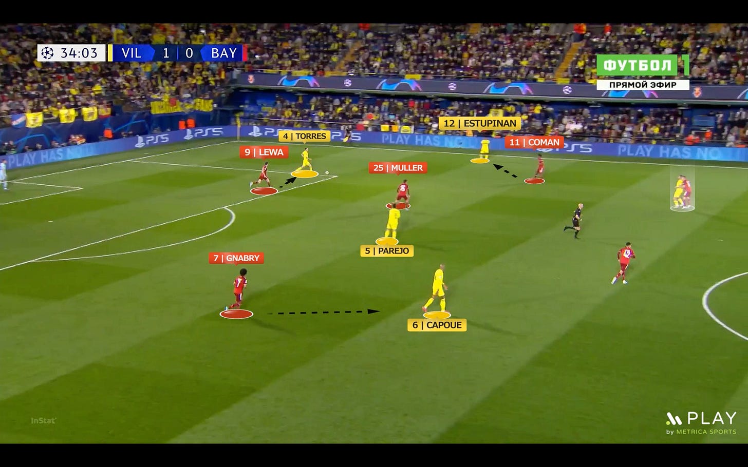 As you can see now, thanks to Nagelsmann tactical tweak, he changed the previous 2v1 situations into a 2v3 situation; with Davies staying back and Musiala getting closer so Lo Celso is marked by Kimmich and not a passing option for Villarreal anymore.