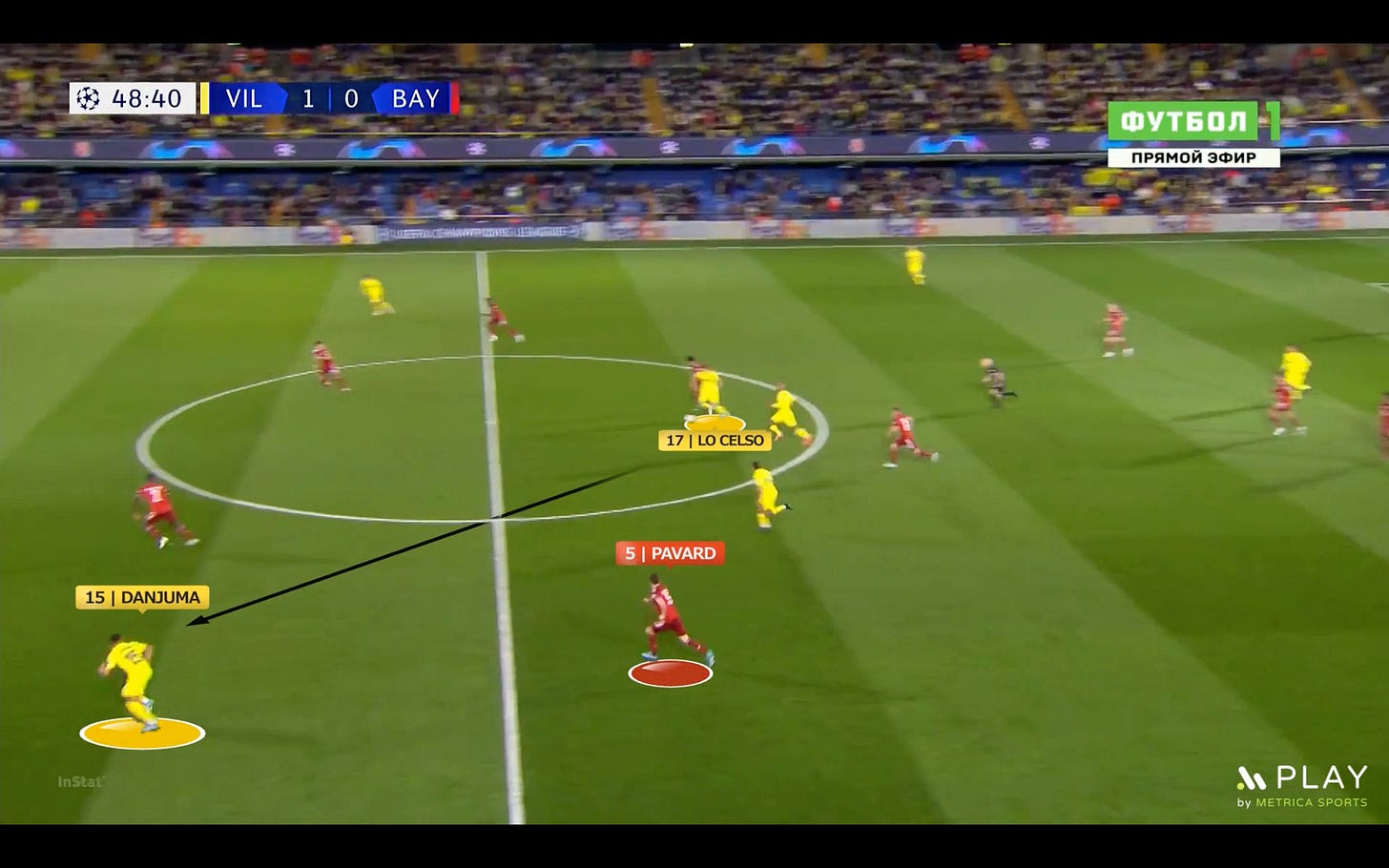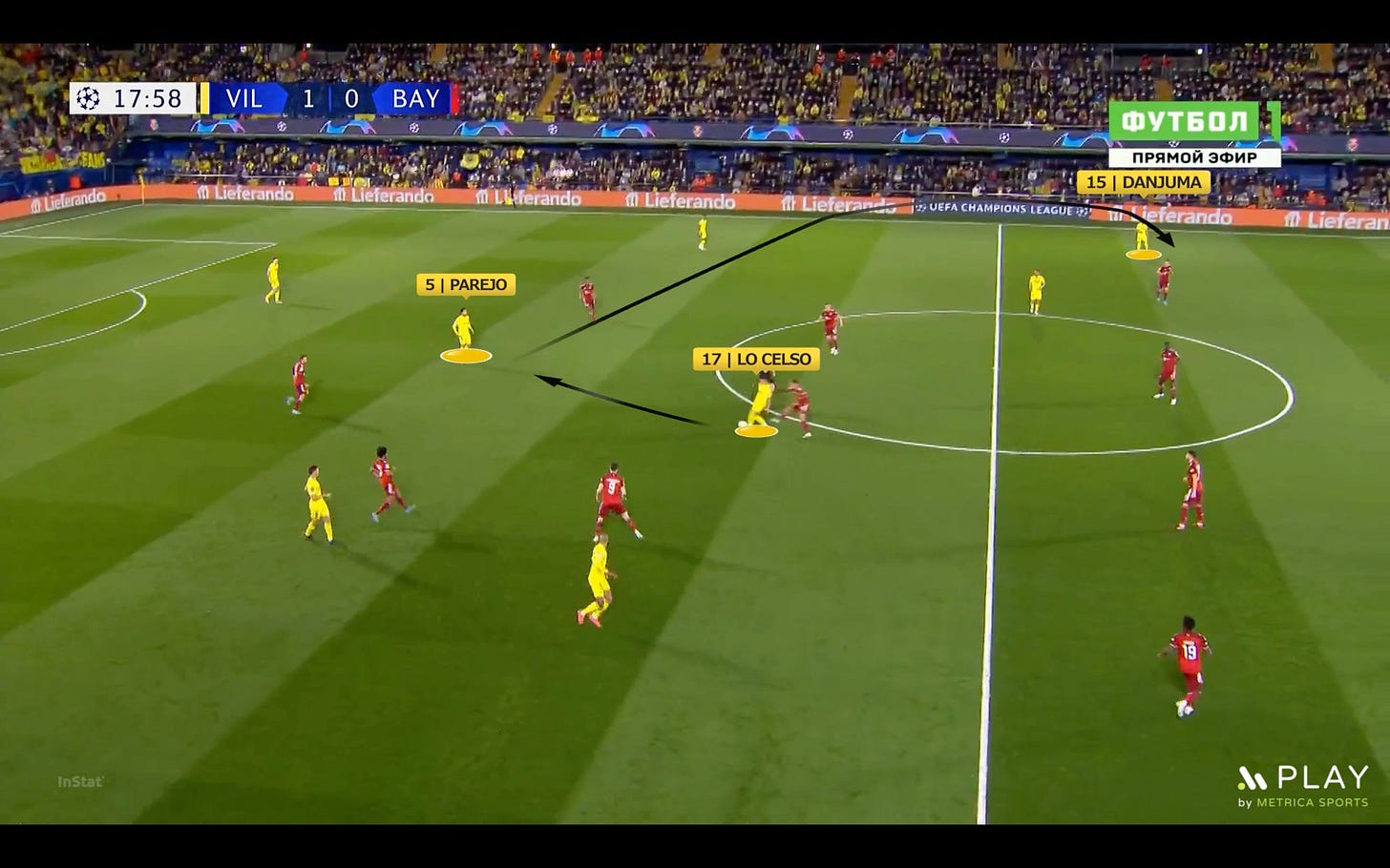 What Villarreal’s been trying to do in this phase is to create space for Lo Celso to receive after he tucks in, so he can either dribble with the ball forward or play the lay-off pass to Parejo who has the ability to deliver long balls to Danjuma(15), ideally to get him in 1v1 situations with Pavard or Upamecano.